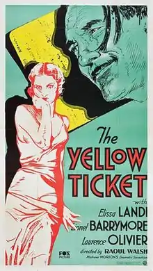The Yellow Ticket is a 1931 pre-Code American drama film based on the 1914 play of the same name by Michael Morton, produced by the Fox Film Corporation, directed by Raoul Walsh, and starring Elissa Landi, Lionel Barrymore and Laurence Olivier. Boris Karloff appears briefly in a small supporting role. The picture is also a noteworthy example of productions from the pre-Code era in that it includes brief nudity.