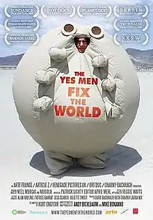 The Yes Men Fix the World is a 2009 English language documentary film about the culture jamming exploits of The Yes Men. The film premiered in New York City and Los Angeles on October 23, 2009, and in other U.S. cities beginning on October 30. Due to the movie being sued by United States Chamber of Commerce, a special edition of the movie is distributed through bittorrent through VODO and other prominent torrent sites like The Pirate Bay and EZTV.[1][2]