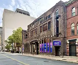 The historic Art Deco Building at 233 Pearl Street was built in 1927.[1] TheaterWorks operated in the building in the 1980s, finally purchasing it outright in 1993.[9] In 2008, the building was renamed City Arts on Pearl. TheaterWorks converted the building into an arts center, now home to numerous nonprofit organizations as well as performance, gallery, office, rehearsal, and storage spaces. The theater itself is in the basement of the building and is a small intimate space. It seats 195 people and is only 8 rows back in any direction.[10][11] The large, brick building is in Art Deco style with decorative Moorish Revival touches.[12][13]