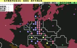 The game allows the player to request chemical and nuclear tactical strikes against the enemy. A chemical attack is automatically targeted at an enemy capital city, and will conclude with a readout announcing the outcome of the attack, such as civilian casualties. In order to launch a strategic nuclear attack, the player is given 30 seconds to call a dedicated 1-800 telephone number and obtain a special authorisation code from the automated answerphone message (the authorisation code was 'Midnight Sun').[9][5][3][10] Once the authorisation code has been received, the player will be given three separate options on how to proceed. Standby mode will postpone the nuclear launch, whereas a strategic launch will involve one nuclear warhead targeting a city. The third option, known as "Fire-Plan", will issue a full-scale nuclear strike across Europe and results in a nuclear holocaust, which will end the game.[5][3][8]