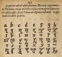 It is also known as the Honorian alphabet or the Runes of Honorius after the legendary magus (though Theban is dissimilar to the Germanic runic alphabet), or the witches' alphabet due to its use in modern Wicca and other forms of witchcraft as one of many substitution ciphers to hide magical writings such as the contents of a Book of Shadows from prying eyes. The Theban alphabet has not been found in any publications prior to that of Trithemius, and bears little visual resemblance to most other alphabets.[5]