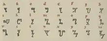 The Theban alphabet, also known as the witches' alphabet, is a writing system, specifically a substitution cipher of the Latin script, that was used by early modern occultists and is popular in the Wicca movement.[1][2]