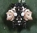 Females grow to about 6 to 10 millimetres (0.24 to 0.39 in) long, while males reach a size of 3 to 5 millimetres (0.12 to 0.20 in).[4] Females have six abdominal spines ending in distinct sharp points. Most have two large white spots on the upper surface of their abdomens, which are otherwise mottled with black, brown, and white patterns.[5]