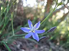 Thelionema caespitosum, the tufted lily or tufted blue-lily, is a species of perennial herb, native to Australia. The lily-like flowers are blue, light blue, pale yellow or white and have yellow stamens.