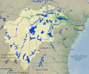 The Thelon River (Inuktitut: Akilinik, lit. "on the other side")[5] stretches 900 kilometres (560 mi) across northern Canada. Its source is Whitefish Lake in the Northwest Territories, and it flows east to Baker Lake in Nunavut. The Thelon ultimately drains into Hudson Bay at Chesterfield Inlet.