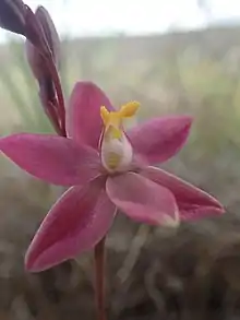 Thelymitra maculata, commonly called the spotted curly locks[2] or eastern curly locks,[3] is a species of orchid in the family Orchidaceae and endemic to the south-west of Western Australia. It has a single erect leaf, spiralling around the flowering stem and a single pink or purplish, spotted flower with more or less circular, yellow ear-like arms on the sides of the column.