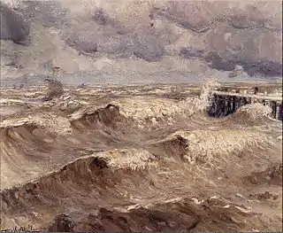 The financial situation of Verstraete improved after he was introduced in 1886 to art collector and patron Henri Van Cutsem. Van Cutsem encouraged Verstraete to travel to various places in the Netherlands such as Hansweert, Leiden, Utrecht and Schoore in Zeeland, where he etched and painted. Theodoor Verstraete also spent time in Blankenberge on the Belgian coast where Van Cutsem owned a villa and invited his artist friends to visit. Verstraete was fascinated with the mobile spectacle of water and air near the sea. While the relationship with Van Cutsem resulted in a considerable improvement of Verstraete's finances, he was in 1893 struck by a stroke, which possibly led to blindness and inability to speak. This signaled the end of the artistic career of Verstraete.[4][5]