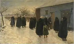 In his early works created in Brasschaat Theodoor Verstraete was driven by his social consciousness and compassion with the villagers. Verstraete described his works as expressions of his feelings of compassion with, and admiration for, the peasants who had to struggle with the ungrateful earth for their survival. He painted sad impressions of resignedly working, deeply devout peasants in a melancholic environment.[10] These melancholic early works, such as After the funeral (1876–1880, Royal Museums of Fine Arts of Belgium), express in their gloomy atmosphere the poverty of the peasants and their submissiveness to the land.[6] The works of this period show subjects that allowed Verstraete to give free rein to his urge for poetic dreaminess and sentimentality.[11]