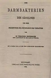 In 1886, after intensive laboratory investigations, Escherich published a monograph on the relationship of intestinal bacteria to the physiology of digestion in the infant. This work, presented to the medical faculty in Munich and published in Stuttgart, Die Darmbakterien des Säuglings und ihre Beziehungen zur Physiologie der Verdauung (1886) (Enterobacteria of infants and their relation to digestion physiology), was to become his habilitation treatise and established him as the leading bacteriologist in the field of paediatrics.