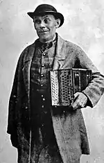 Larsson was born June 8, 1880, in Gylle parish near the town of Trelleborg in Skåne. He died June 30, 1937, in Mjölby. A Swedish bondkomiker (rustic comic) and lyricist, his professional name was Skånska Lasse (Skåning Lasse). He worked as a cabinetmaker in Malmö, then for a short time in Stockholm before moving to Östergötland, where he found employment at a furniture factory in Mjölby. It was during his time there that Larsson embarked on his course as an entertainer. He often performed in a long coat with a flowery vest while playing the accordion. Married twice, he was the father of eleven children, several of whom also became entertainers.[1]