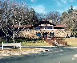 A geographic marker at one corner of the park grounds, at Wirth Parkway and Golden Valley Road, marks the 45 degrees latitude line, exactly halfway between the equator and the North Pole.[1] The badly weathered plaque was refurbished around 2006.