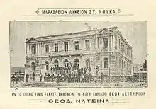 After 1921 he worked in Thessaloniki. Initially, together with a partner, G. Karantanis, they took over the management of a school established by Stefanos Noukas (the Marasleia School).[3] At first, the school was known as the Natsinas - Karantanis School, but, subsequently, after the two partners split, the school was renamed the Theodoros Natsinas School.