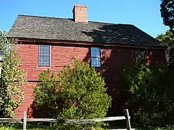 The Theophilus Jones House stands in a residential area southwest of downtown Wallingford, on the west side of Jones Road south of Apple Tree Lane. It is a 2+1⁄2-story wood-frame structure, with a gabled roof, central chimney, and clapboarded exterior. The main facade is three bays wide, with sash windows arranged symmetrically around the center entrance. The second floor has a slight overhang over the first floor, and windows on both levels butt against eaves. The entrance is simply framed, with a multilight transom window above. The interior is a combination of original, recycled, and reproduction finishes.[2]