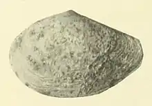 The shell is small and thin, with inequally sized and asymmetric valves. It is about 1.5 times as long as high, rounded in the front, subtruncate behind and moderately swollen in the central region. The umbos are small and point out slightly; they are situated nearer to the anterior than the posterior end. The dorsal margin from the umbo to the upper end of the anterior margin is slightly convex, and from the umbo to the posterior region is straight and sloping. The lower margin is convex and evenly curved, and the surface of the upper part of the shell is striated with fine, irregular, transverse concentric markings. The right valve measures 8.5 mm (0.33 in) in breadth and 5.5 mm (0.22 in) in height, and the right valve 8.0 mm (0.31 in) and 5.4 mm (0.21 in).[7]