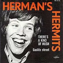 However an expedient cover by British invasion group Herman's Hermits[1] was released in the US in January 1967 to reach the Top 30 of the Billboard Hot 100 in three weeks and proceeded to a peak of #4—affording the group their final US Top Ten hit—with Gold certification for US sales of one million units awarded that April. The record notched two positions higher on the Silver Dollar Survey for 3–10 March 1967 on WLS,[2] for an overall rank of #26 for 1967,[3] and topped the Boss 30 for 8–22 March 1967 on KHJ.[4] In the UK Herman's Hermits' "There's a Kind of Hush" would reach No. 7. The success of the Herman's Hermits version led to the release of the original New Vaudeville Band track as a single in some territories with both of these versions charting in Australia with peaks of No. 5 (Herman's Hermits) and No. 12 (New Vaudeville Band) and also in South Africa where the New Vaudeville Band bested the Herman's Hermits' No. 9 peak by reaching No. 4.