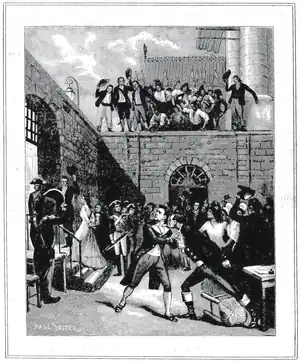 In the lesser court of the Conciergerie, Debrun, Brault and others, jailers, turn-keys, National Guards, gendarmes and executioners, including the Chief Headsman, Sanson, are waiting to send the tumbrels containing the condemned prisoners forth to the guillotine. Brault's daughter is watering her flowers at a window. All are talking about the late events and wondering what has been done with Robespierre, some being in his favour, others against him. Labussière and Martial enter, searching for Fabienne. Labussière is known to all as a government official, and has specially recommended himself to Madame and Mademoiselle Brault (the wife and daughter of the head jailer) by giving them free tickets to the theatre. Through them a note is conveyed to Fabienne, a letter and a flower, bidding Martial an eternal farewell and telling him that the sight of her companion nuns going to prison has recalled her to her religious duty, and that they must wait to meet in heaven.