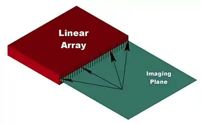 Linear transducer arrays (both curved and straight) are commonly used in conventional medical ultrasound. They are available in a wide variety of sizes and shapes. They are easily adapted for use in thermoacoustic imaging. Figure 7 illustrates how a linear array is used for 2D thermoacoustic imaging. The array consists of a number of elements (64 - 256) that are focused in the vertical dimension to maintain maximum sensitivity within a 2D plane extending outward from the front face of the array. Thermoacoustic signals within the plane are localized by calculating the times-of-flight from each position within the plane to each element of the array (arrows, Fig. 7).[20]