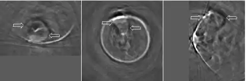 Fig. 2: First 3D thermoacoustic image of breast cancer. From left to right: axial, coronal and sagittal views of the cancer (arrows).