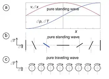 If or , we have a pure traveling wave. In this case, Eqs.(1) and (2) represent circles in the δT – δx diagram as shown in Fig. 1c, which applies to a pure traveling wave to the right. The gas moves to the right with a high temperature and back with a low temperature, so there is a net transport of energy.