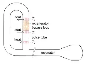Figure 3 is a schematic drawing of a travelling-wave thermoacoustic engine. It consists of a resonator tube and a loop which contains a regenerator, three heat exchangers, and a bypass loop. A regenerator is a porous medium with a high heat capacity. As the gas flows back and forth through the regenerator, it periodically stores and takes up heat from the regenerator material. In contrast to the stack, the pores in the regenerator are much smaller than the thermal penetration depth, so the thermal contact between gas and material is very good. Ideally, the energy flow in the regenerator is zero, so the main energy flow in the loop is from the hot heat exchanger via the pulse tube and the bypass loop to the heat exchanger at the other side of the regenerator (main heat exchanger). The energy in the loop is transported via a travelling wave as in Fig. 1c, hence the name travelling-wave systems. The ratio of the volume flows at the ends of the regenerator is TH/Ta, so the regenerator acts as a volume-flow amplifier. Just like in the case of the standing-wave system, the machine "spontaneously" produces sound if the temperature TH is high enough. The resulting pressure oscillations can be used in a variety of ways, such as in producing electricity, cooling, and heat pumping.