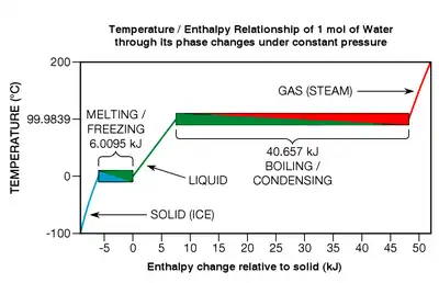 34. Water's enthalpy of fusion is 6.0095 kJ⋅mol−1 K−1 (0 °C, 101.325 kPa). Citation: Water Structure and Science, Water Properties, Enthalpy of fusion, (0 °C, 101.325 kPa) (by London South Bank University). Link to Web site. The only metals with enthalpies of fusion not in the range of 6–30 J mol−1 K−1 are (on the high side): Ta, W, and Re; and (on the low side) most of the group 1 (alkaline) metals plus Ga, In, Hg, Tl, Pb, and Np. Citation: This link to Web Elements' home page.