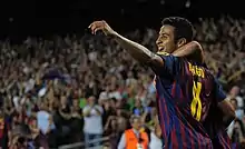 Thiago started the 2011–12 season with the first leg of the Spanish Supercopa match against rivals Real Madrid, being substituted for Xavi after 58 minutes, and was an unused substitute as they defeated FC Porto for the 2011 UEFA Super Cup. He then scored in Barcelona's first La Liga match of the season in a 5–0 home win against Villarreal CF.[15] On 18 December, he started as Barcelona won 4–0 in the Club World Cup final at International Stadium Yokohama.[16] Thiago also netted Barcelona's fifth in a 7–0 win against Rayo Vallecano on 29 April from a close-range header.[17] He followed this with a dance with Dani Alves then stopped by Carles Puyol.[18]