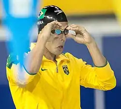 At the 2009 World Aquatics Championships in Rome, he finished 4th in the 200-meter individual medley,[71] 4th in the 400-meter individual medley[72] and 10th in the 4×200-meter freestyle.[73] Pereira thrice broke the South American record in the 200-meter individual medley, in the heats (1:57.66), semifinal (1:57.35) and final (1:55.55), only 19 hundredths of a second away from winning a bronze medal and 31 hundredths away from winning a silver medal.[74][75] In the 400-meter individual medley, Pereira broke his South American record by more than 2 seconds, with a time of 4:08.86, but he was still one second behind the medalists.[76] In the 4×200-meter freestyle, he broke the South American record in the 200-meter freestyle with a time of 1:46.57, at the relay's opening, and the 4×200-meter freestyle record with a time of 7:09.71.[77]