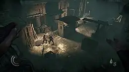 There are a variety of routes through each level and the player is able to utilize a variety of playing styles to traverse them.[11] The game contains a variety of ways to distract or kill guards, such as barrels of oil which can be set alight. Levels contain coins and valuable objects which Garrett can steal; these are converted into money which can be spent on equipment and upgrades. Garrett is able to pickpocket guards and other characters.[12] The player may evade guards by hiding in shadows or around corners and is able to peek around edges and through keyholes in order to track the movements of enemies. Once Garrett has been spotted, guards and other non-player characters will attempt to hunt him down. The developers have stated that the game's artificial intelligence is aware of the level design, and as such guards will know in advance of potential hiding spots that the player may be utilizing.[12][13]