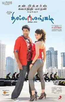 Thillalangadi (transl. Defiler) is a 2010 Indian Tamil-language action comedy film directed by M. Raja. A remake of the 2009 Telugu film Kick, it stars Raja's brother Jayam Ravi along with Tamannaah Bhatia, and Shaam, who reprises his role from Kick, and a supporting cast including Prabhu, Suhasini Maniratnam, Vadivelu, Santhanam, and Sanchita Shetty. The film features a soundtrack composed by Yuvan Shankar Raja, whilst S. Thaman's original score has been reused. The film, produced by Raja's father Editor Mohan and to be distributed by Sun Pictures, released on 23 July 2010.