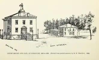 In 1830, as the economic center of the county changed with the growth of a salt industry, the court was moved to a new building between the towns of Salina, where the most salt was produced, and Syracuse, where it was shipped out.[7][9] This building was only slightly larger than the first, had a jail on the first floor, and a courtroom on the second.[9] Both villages continued to advocate for relocation of the courthouse into their borders, as they saw the prosperity that had left Onondaga Hill with the county seat. Tensions between Syracuse and Salina continued until the towns were merged in 1848 with the formation of the city of Syracuse. In 1856, the existing courthouse was destroyed by arson, and work began deciding where to build a new one.[7]