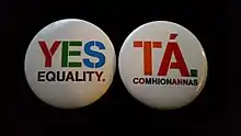 All four main parties in the Dáil supported the bill: the governing Fine Gael and Labour, and the opposition Fianna Fáil and Sinn Féin. Members of the Green Party, Anti-Austerity Alliance, People Before Profit Alliance, Workers' Party and independents are also on record in support of the amendment.[34] "Yes Equality" was an umbrella campaign by Gay and Lesbian Equality Network (GLEN), the Irish Council for Civil Liberties and Marriage Equality.[35]
