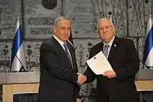 The thirty-fourth government of Israel, also known as the Fourth Netanyahu Government,[1] was the government of Israel, headed by Prime Minister Benjamin Netanyahu between 2015 and 2020. It was formed after the March 2015 Knesset election. The coalition that made up the government, consisting of Likud, United Torah Judaism, Shas, Kulanu and the Jewish Home, was submitted to the President of Israel just before the deadline on 6 May 2015. Government ministers were introduced, approved by the Knesset and sworn in on 14 May. Deputy ministers were sworn in on 19 May. On 29 December 2018, the newly formed New Right party became a coalition partner, after splitting from the Jewish Home.