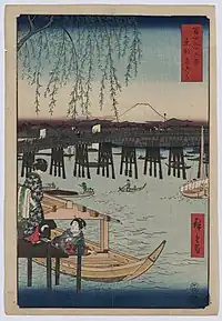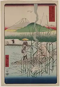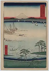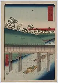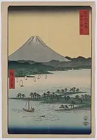 Thirty-six Views of Mount Fuji (Japanese: 富士三十六景, Hepburn: Fuji Sanjū-Rokkei) is the title of two series of woodblock prints by Japanese ukiyo-e artist Hiroshige, depicting Mount Fuji in differing seasons and weather conditions from a variety of different places and distances. The 1852 series, published by Sanoya Kihei, are in landscape orientation using the chūban format, while the 1858 series are in the portrait ōban format and were published by Tsutaya Kichizō.[1][2] The same subject had previously been dealt with by Hokusai in two of his own series, Thirty-six Views of Mount Fuji, produced from c.1830 to 1832,[3] and One Hundred Views of Mount Fuji, published in three volumes from 1834 to 1849.[4]