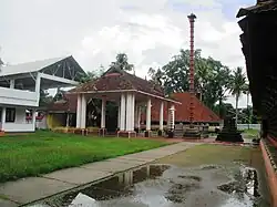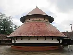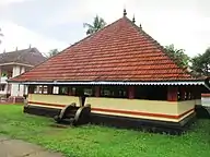 The temple is built in Kerala style architecture, common in all temples in the South Indian state of Kerala in Eastern axis. The temple has no gateway tower and has an arch from the main road. A rectangular wall around the temple, called Kshetra-Madilluka pierced by the gateways, encloses all the shrines of the temple. The metal plated flagpost or dvajasthambam is located axial to the temple tower leading to the central sanctum. Chuttuambalam is the outer pavilion within the temple walls. The central shrine and the associated hall is located in a rectangular structure called Nallambalam, which has pillared halls and corridors.[6] Between the entrance of Nallambalam to the sanctum, there is a raised square platform called Namaskara Mandapa which has a pyramidal roof. Thevrapura, the kitchen used to cook offering to the deity is located on the left of Namaskara Mandapa from the entrance. Balithara is an altar is used for making ritualistic offering to demi-gods and the festive deities. The central shrine called Sreekovil houses the image of the presiding deity. It is on an elevated platform with a single door reached through five steps. As per Kerala rituals, only the main priest called Thantri and the second priest called Melshanthi alone can enter the Sree Kovil.[7] The central shrine has a circular plan with the base built of granite, superstructure built of laterite and conical roof made of terrocata tile supported from inside by a wooden structure.[8] The temple has shrines of Shiva in the form of Dakshinamurthy, Krishna, Bhagavathy and Ayyappa.[9]