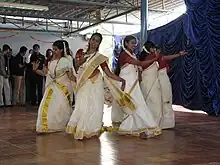 Thiruvathirakali is a dance form performed by women on the day of Thiruvathira to the accompaniment of Thiruvathira paattu, folk songs telling tales of lovesick Parvati, her longing and penance for Shiva's affection and Shiva's might and power.[37] The sinuous movements executed by the group of dancers around a nilavilakku embody lasya or the amorous charm and grace of the feminine. The dance follows a circular, pirouetting pattern accompanied by clapping of the hands and singing. Today, Thiruvathirakali has become a popular dance form for all seasons. Thiruvathira kali is a typical dance form of Kerala. This is a female group dance made up of simple yet very attractive steps. In ancient times, women use to perform this dance in their homes during festivals and functions, giving it the Malayalam name aka Kaikottikali: aka-inside + kaikottikali-play clapping hands. Lore has it that Thiruvathira Kali is in memory of Shiva taking Parvati as his wife. A group of women dressed in typical Kerala style with mundu and neriyathu and the hair bun adorned with jasmine garlands perform this dance during festival seasons. Kaikottikkali spreads the message of joy and also illustrates the emotions of a married woman towards her beloved and of the unmarried woman longing for one. Thiruvathira is also known as the Kerala's own version of Karva Chauth.[38]