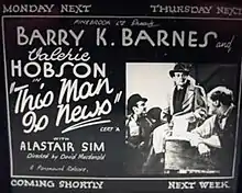 This Man is News is a 1938 British comedy mystery film directed by David MacDonald and starring Barry K. Barnes, Valerie Hobson, Alastair Sim and Edward Lexy. The screenplay concerns a journalist who solves a crime of which he himself is suspected .[2] A "quota quickie", it was made for a mere £6,000, but "was among the highest grossing films of 1938".[3]
