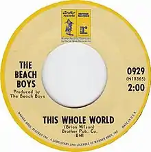 "This Whole World" is a song by American rock band the Beach Boys from their 1970 album Sunflower. Written by Brian Wilson, the song features his brother Carl on lead vocals and is credited as a Beach Boys production. Earlier in the year, it had been included on the Warner Brothers promotional sampler album The Big Ball, and as a single, fronted with "Slip On Through", but did not make the U.S. or UK pop charts.