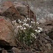This plant is a perennial herb growing roughly 10 centimeters tall,[7] the height varying from 1 to 20 centimeters.[3] There are spatula-shaped[7] lower leaves a few centimeters long and a few leaves higher on the plant. The inflorescence is a raceme of mustardlike flowers with white spoon-shaped[3] petals just under a centimeter in length. The fruit is a silique.[3][7] The plant often reproduces vegetatively by cloning.[4]