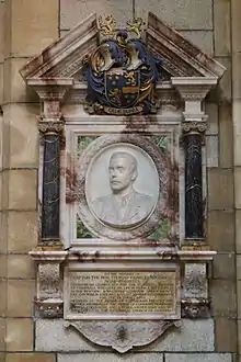 Agar-Robartes is commemorated on Panel 8 of the Parliamentary War Memorial in Westminster Hall, one of 22 MPs who died during World War I to be named on that memorial.[9][10] Agar-Robartes is one of 19 MPs who fell in the war who are commemorated by heraldic shields in the Commons Chamber.[11] A further act of commemoration came with the unveiling in 1932 of a manuscript-style illuminated book of remembrance for the House of Commons, which included a short biographical account of the life and death of Agar-Robartes.[12][13] As Agar-Robartes never married and had no children, his younger brother Francis later succeeded their father in the viscountcy.