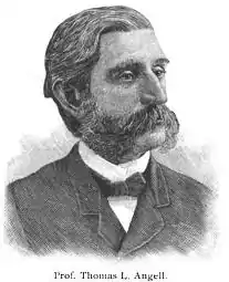 Thomas L. Angell was born in 1837 in Greenville, Rhode Island to Pardon and Mary Ann Angell who were both descendants of Thomas Angell, a Baptist, who was one of the first settlers of Rhode Island.[1] Angell attended the common school in Greenville and the Smithville Seminary[2] and then Thetford Academy, Vermont and Wilbraham Academy where he prepared to attend Brown University, enrolling in 1858. In 1862 during the Civil War, Angell graduated from Brown and enlisted in the Rhode Island militia as aide de camp for General Tourtellotte. Upon his graduation, Angell taught school briefly in Greenville before attending Hartford Seminary. In 1864 started teaching at the Lapham Institute in North Scituate, Rhode Island with Benjamin F. Hayes, and eventually he succeeded Hayes as principal, working at the school for four years. In 1869, he followed Hayes to Bates College succeeding him as Professor of French and German (Modern Languages), and Angell remained at Bates until 1902. Angell also served as a Free Will Baptist pastor.[3][4]