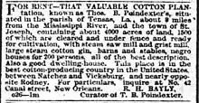 As of the 1850 census, Poindexter was enumerated in Tensas Parish, Louisiana with John Jenkins Poindexter (likely his brother or cousin) and the widowed John J.'s nine-year-old son.[11] According to an advertisement placed in the New Orleans Crescent in 1865, Poindexter's 4,000-acre (1,600 ha; 6.3 sq mi) Tensas Parish plantation was located about 3 miles (4.8 km) inland from St. Joseph on the Mississippi River, in an area said to be "the best cotton-producing country in the United States, between Natchez and Vicksburg, and nearly opposite Rodney." The property had "a good dwelling house" and "negro houses for 200 persons". Of the 4,000 total acres, 1,500 had been cleared and put "under fence and ready for cultivation, with steam saw mill and grist mill, large steam cotton gin, barns and stables...all of the best description".[12]