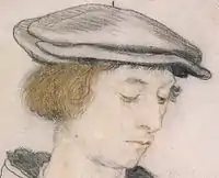 A Tudor cap, as worn by John More (1508-c. 1559) son of Sir Thomas More. Detail of drawing by Holbein, Royal Collection, Windsor.