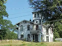 The Thomas C. Wilkinson House is an Italian Villa style home that sits on a large lot high above street level. The two-story house is frame construction with a front gable, L-plan main block. It features a three-stage, square tower. The third level is not original to the house. The windows on the west wing appear to be from the turn of the 20th-century and suggest this portion of the house was built later than the rest of the structure.[2] The house features a bracketed cornice on the main block, an entrance porch with a spindle frieze and wrought iron railings. The main façade has two round-arched windows on both levels. The lower-level windows are taller than the upper-level windows and they all feature muntins. There are two circular windows above the ground level in the basement.