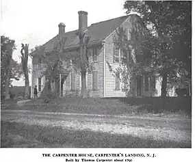 In 1787, Carpenter bought and restored a house in Mantua Township once owned by Restore Eastlack, who died in 1773. This indicates the original portion of the house was built during or prior to 1773. Carpenter added a southern half and a second story and lived there until his death in 1847. Today, it is known as the Thomas Carpenter House. While it is in private hands, the timber framed, two and one half story house is considered a historical site by Gloucester County, New Jersey and the Library of Congress. The house is located at the southwest corner of Main and Martel Streets in Mantua Township, New Jersey.[16][17] The house does not seem to be registered with the National Register of Historic Places, but it has a Historic American Buildings Survey number: HABS NJ-68 and a Library of Congress call number of HABS NJ,8-MANT,1-[18]