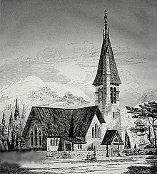 Sorby began designing for Canadian clients while still domiciled in the United Kingdom. He designed an Anglican church "on the banks of Lake Huron", possibly at Collingwood, in the Huron Anglican Diocese in 1859, early in his career.[115] The church was for a "small and scattered congregation". Its north transept contained a lower room for the heating boilers and for tea-making, and an upper area for the small pipe organ. At the base of the tower was a small vestry. At the north-east corner of the tower was a "smole", or chimney for the boiler smoke, disguised as a turret. The height of the spire to the top of the weather vane was 76 ft (23.16 m).[116]
