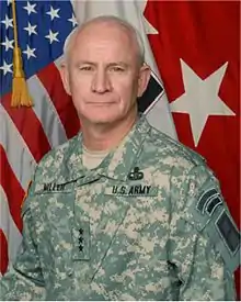 Miller was commissioned in 1973 as an Infantry Officer after graduating from the University of Southern Mississippi as a Distinguished Military Graduate.[1] He has served primarily with Infantry, Special Forces and Airborne units. This included assignments in the 7th Special Forces Group, 82d Airborne Division, 101st Airborne Division, 10th Mountain Division and the 25th Infantry Division. Additionally he served overseas in Iraq, Kuwait, Haiti, Hawaii, Korea, and Japan. Prior to commanding the First Army, he served as the Director of Operations for FORSCOM and in Iraq as the Director of Operations for CJTF-7, and later as the Director of Strategic Operations for Multinational Forces Iraq.[1][4] Miller is also a graduate of the United States Army War College and holds a Master of Science in Management.[1]