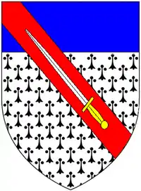 Arms of Gladwin: Ermine, a chief azure over all a bend gules charged with a sword argent hilt and pomel or. Granted by the College of Arms in 1660[1]