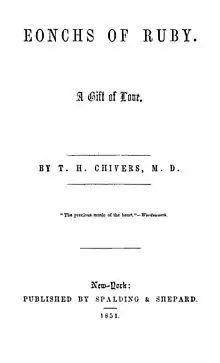 From 1845 to 1850, Chivers had been living with his wife in Georgia, then spent the next five years in the North. His poetry collection Eonchs of Ruby, A Gift of Love was published in 1851 with a subtitle meant to capitalize on the gift book trend. Chivers explained the title: "The Word Eonch is the same as Concha Marina—Shell of the Sea. Eonch is used... merely for its euphony."[29] Throughout the collection, Chivers experiments with the sonic effects of words rather than their literal meaning.[30] Atlanta: or the True Blessed Island of Poesy: A Paul Epic in Three Lustra was first published in three installments in the Georgia Citizen beginning in January 1853.[31] Later that year, Memoralia; or, Philas of Amber Full of the Tears of Love was printed in Philadelphia, Pennsylvania and generally received unfavorably.[32] Very shortly after, the same publisher brought out Virginalia; or, Songs of My Summer Nights, a collection made up of poems that were generally under 200 lines each, about half of which had previously been published in magazines.[33]