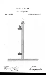 Thomas J. Martin (1842-1872)[1] was awarded a patent for improvement to the fire extinguisher in 1872.[2][3][4][5] The invention involved the use of pipes to carry water upwards and valves in the ceiling acting as sprinklers to extinguish fires in buildings.[6]