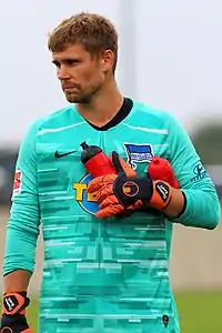 Kraft made his only appearance of the 2016–17 season, coming against Brøndby in the second leg of the UEFA Europa League Third Round, as Hertha BSC lost 3–2, resulting in the club's elimination.[205] However, he remained as Hertha BSC's second choice goalkeeper, with Rune Jarstein being preferred instead.[206][207][208] Along the way, Kraft was sidelined on two occasions throughout the 2016–17 season.[209][210][211] Despite this, he signed a contract with the club, keeping him until 2019.[212] On 20 August 2017, Kraft made his first appearance of the 2017–18 season, starting the whole game, as Hertha BSC's reserve team won 1–0 against Wacker 90 Nordhausen in the first round of the DFB–Pokal.[213] A month later on 20 September 2017, he made his first team appearance of the season (and his UEFA Europa League debut), starting the whole game, and kept a clean sheet, in a 0–0 draw against Athletic Bilbao.[214] Kraft then went on to make three more UEFA Europa League matches for the club, as they were eliminated from the group stage.[215][216][217] Following the absence of Jarstein, Kraft made his return to the league starting line–up for the first time in two years for Hertha BSC against Borussia Dortmund on 20 January 2018, as the club drew 1–1.[218] He then started in the next two matches for Hertha BSC, coming against Werder Bremen and Hoffenheim.[219][220][221] Throughout the 2017–18 season, Kraft remained as the club's second choice goalkeeper behind Jarstein.[222][223][224] Despite this, he went on to make eight appearances in all competitions for Hertha BSC.